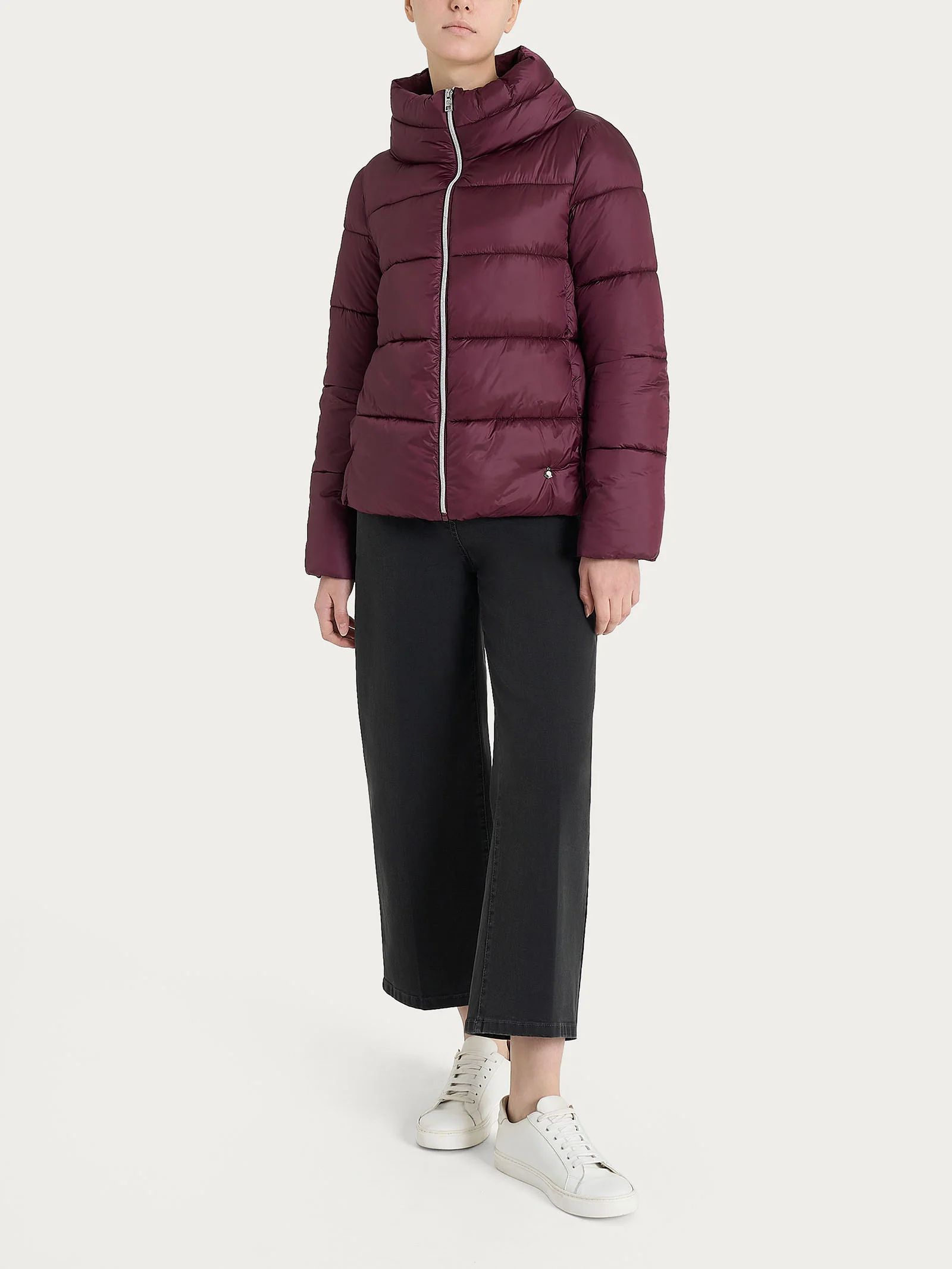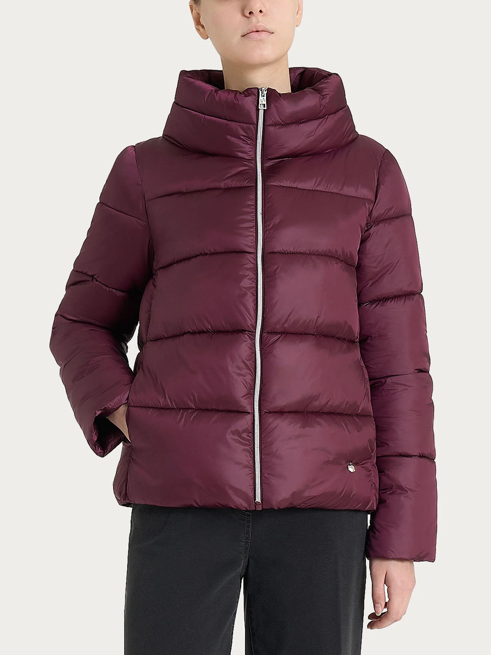 Piumino con collo alto da donna con chiusura frontale con zip e pratiche tasche laterali.