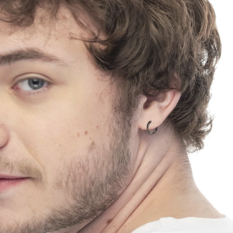 Mono orecchino a cerchio ritorto in acciaio o acciaio con pvd oro o acciaio con pvd nero, con diametro 1,5cm, con chiusura a pressione.